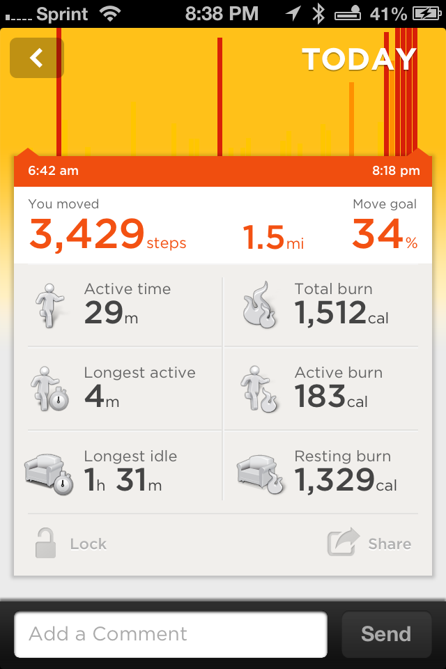 You monitor you activity by plugging the band in the earbud spot of your iPhone (or for you Android) – so it isn’t bluetooth enabled. You can see pretty quickly how you are doing. The charge on the band lasts about 10 days – a little less when you plug in more than twice a day (I know from experience)! You can see how your are doing against your daily goals. And you can add in your workouts too. One of the things I love is you can set an idle reminder when you haven’t moved for awhile – mine is set to vibrate every 30 minutes I don’t move from 8 am – 6 pm. I get quite a few reminders – even during yoga – not a lot of steps.