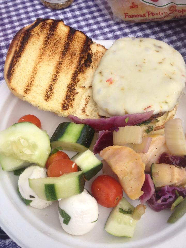 Onto Linner (Lupper) – I tried at the first home game to try Jack Daniel’s pulled pork sandwiches to mix it up a bit – too sweet – off the menu. So last week when I was up with my Mom we had hamburgers and hot dogs – normal tailgate fare. However, before we left NJ we stopped at a local Italian Deli for some yummy, healthy salads – cucumber, tomato and fresh mozzarella and a grilled veggie salad. Delicious and a hit! They will definately be added for future games.